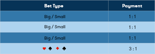 มีการเดิมพันสองประเภทบนลูกเต๋ายอดนิยม: การเดิมพันจะขึ้นอยู่กับผลรวมของลูกเต๋าของทั้งสามลูกเต๋าที่ถือว่าเล็ก ระหว่าง ( 4-10) และมากระหว่าง (11-17)